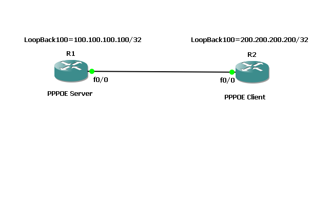 So As usual we will use our simple Topology with two routers with R1 as PPPOE server and R2 as PPPOE Client:
